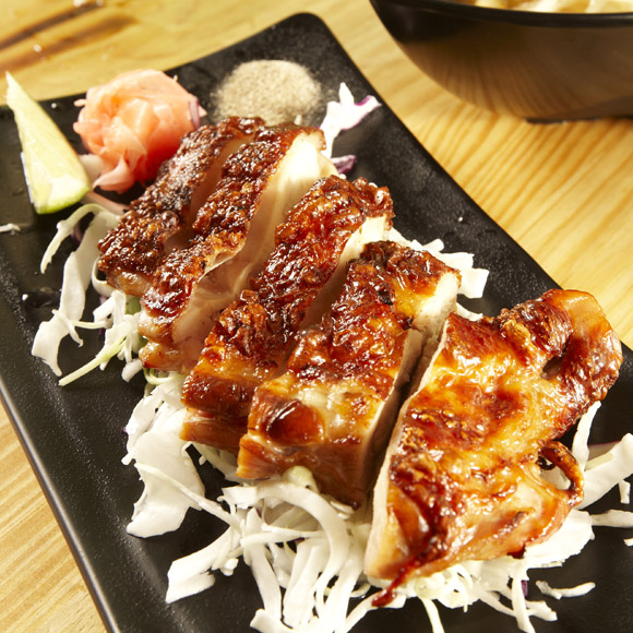 「塩燒醬烤雞腿」肉品現場現醃,直接將鮮嫩的雞腿肉烤至七分熟,外皮金黃酥脆、內而肉質軟嫩,店家特別訂製的蒸烤箱,用高超的烹調的技術,鎖住食材最珍貴的本味,沾上些許胡椒提鮮,一口咬下,在大啖肉品之時,享受原汁原味的暢快。