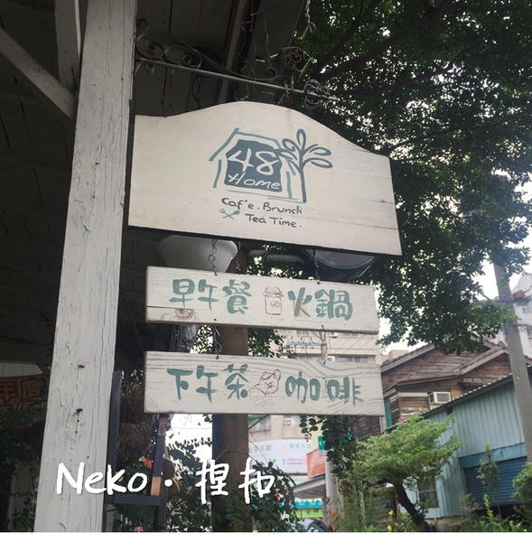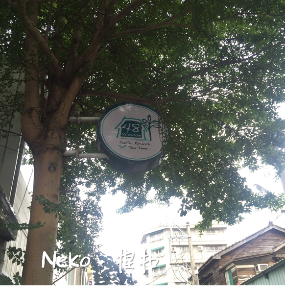 隱身在巷弄之中,所以我們把車子先停在貓尾巴泡芙的對面(民族路上,超大免費停車場),走過來大約五分鐘,48 Home 真的很隱密,連招牌都被樹給遮住了啦!