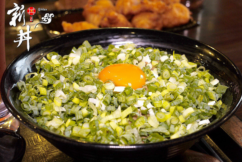 丼飯上面滿滿的蔥花、中間放了一顆生蛋黃,光看我都流口水了~XD