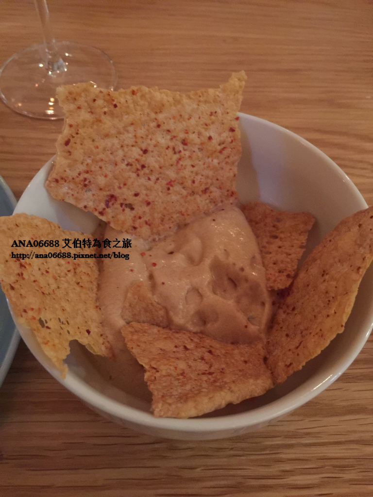 1)開胃小㸃:這是餐廳免費招待的薄餅,吃起來香酥可口,配上特制的花生沾醬,味道實在不佳,花生香氣真不夠,太淡了,給它C。
