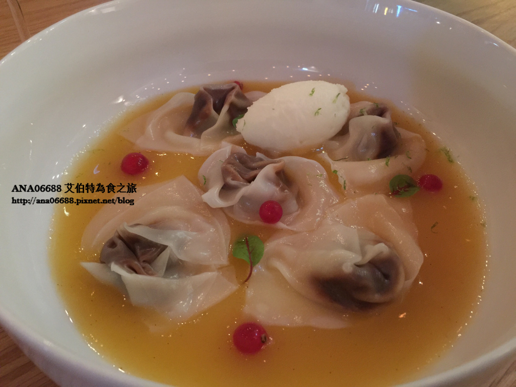 7)甜品 - 榛果小雲呑、柑橘冷湯、檸檬冰沙:雲吞是榛果饀,吃起來甜甜的,有果香。配上冷湯來吃,有明顯甘橘味,可惜橘味太濃,感覺不是天然,大扣分;冰沙的檸檬味蠻清爽的。這道應該是很有層次的甜品,但各味道並不是很搭,不好吃,給它C。