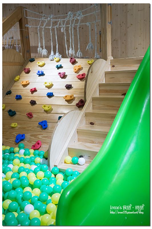 城堡造型的球池,結合溜滑梯、攀岩,也足以讓小孩揮耗體力的地方,
