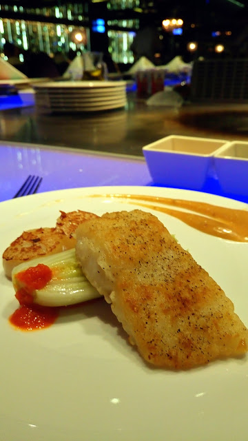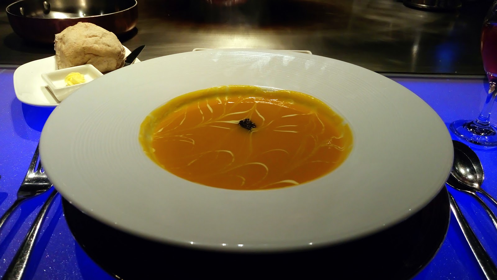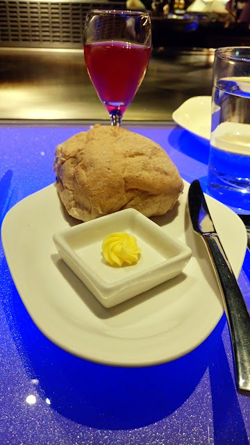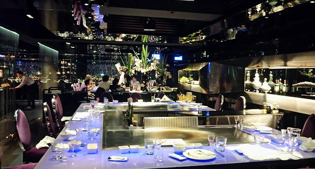 另一側則是有著醒目藍色光的鐵板吧檯桌,吃正餐的地方。