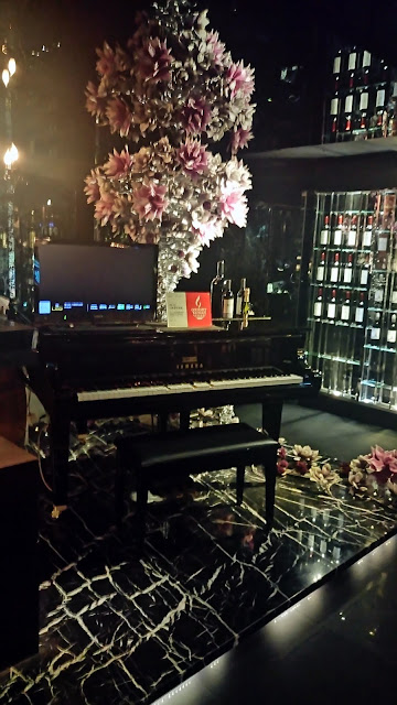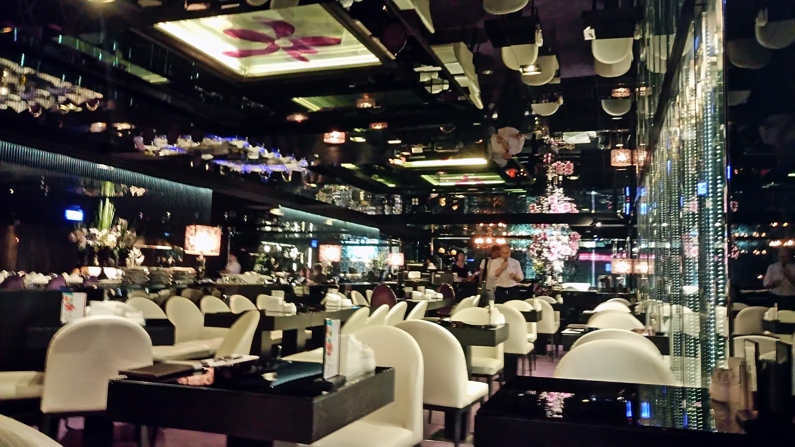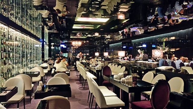 超大的閃閃發亮水晶燈,一整排落地的水晶珠簾子,晶瑩剔透,絢麗的擺設,天花板如鏡面設計,映射後讓整個餐廳看起來目不暇給。