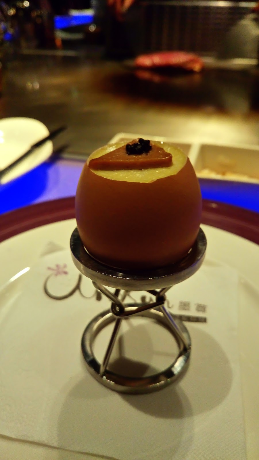▼松露蒸蛋,外觀十分特別,是用真的蛋殼裝的蒸蛋,上面有著小小顆黑粒的是鵝肝醬與魚子醬,松露則是在蛋的下方,用湯匙挖到最底下來吃吧!