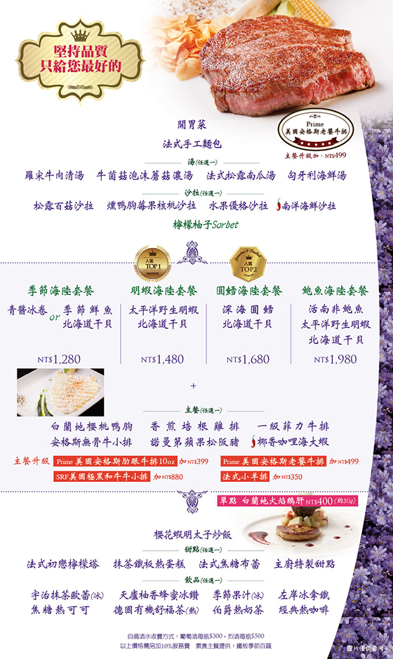 這次選擇的是「季節海陸套餐$1280+10%=$1408」和「明蝦海陸套餐$1480+10%=$1628」。