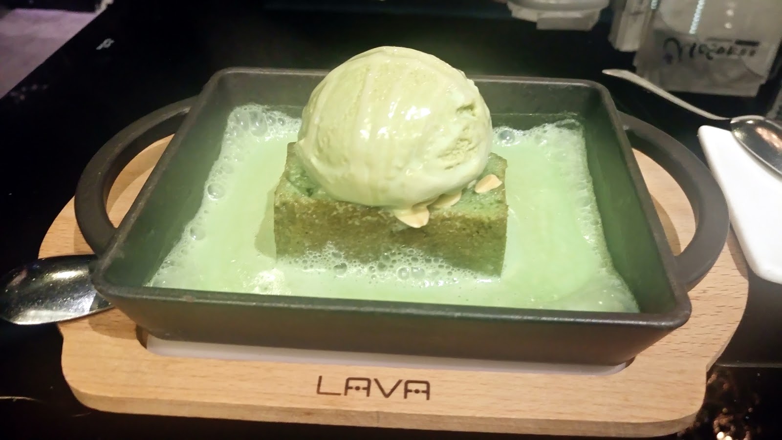 抹茶鐵板熱蛋糕,就是一種有點奇怪的甜點,下面的鐵板是熱的,蛋糕的上頭卻是冰淇淋,冷熱交替,蛋糕會比較硬,後來實在吃不下呀!