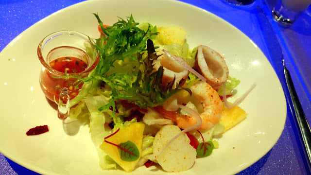 ▼南洋海鮮沙拉,味道很像泰式料理,會辣,但讓人又愛又恨,口味重真的滿好吃的,可是我不太能吃辣,吃一兩口就趕緊喝蔓越莓醋解解辣!