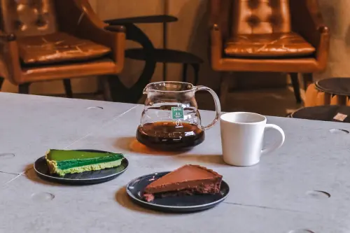 餐後飲品及甜點~飲品我們點了果汁.熱咖啡以及冰咖啡,熱咖啡直接喝蠻香醇的,冰咖啡喝起來酸度偏高,加了奶油球後才感覺比較順口一些,當日的飯後甜點附上的是一小塊巧克力蛋糕以及店內招牌"俄羅斯軟糖".