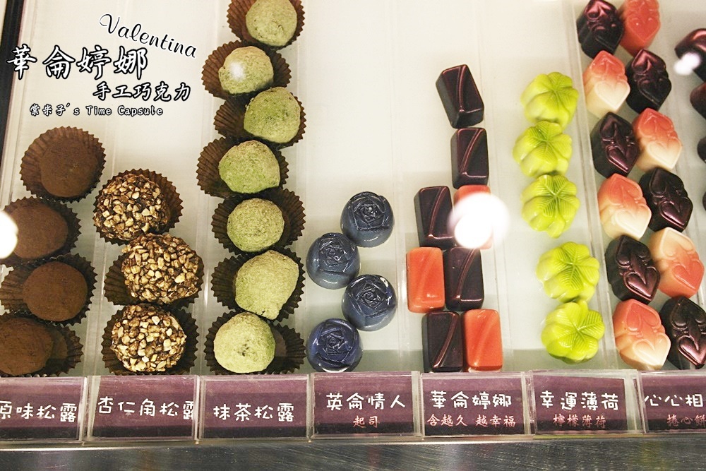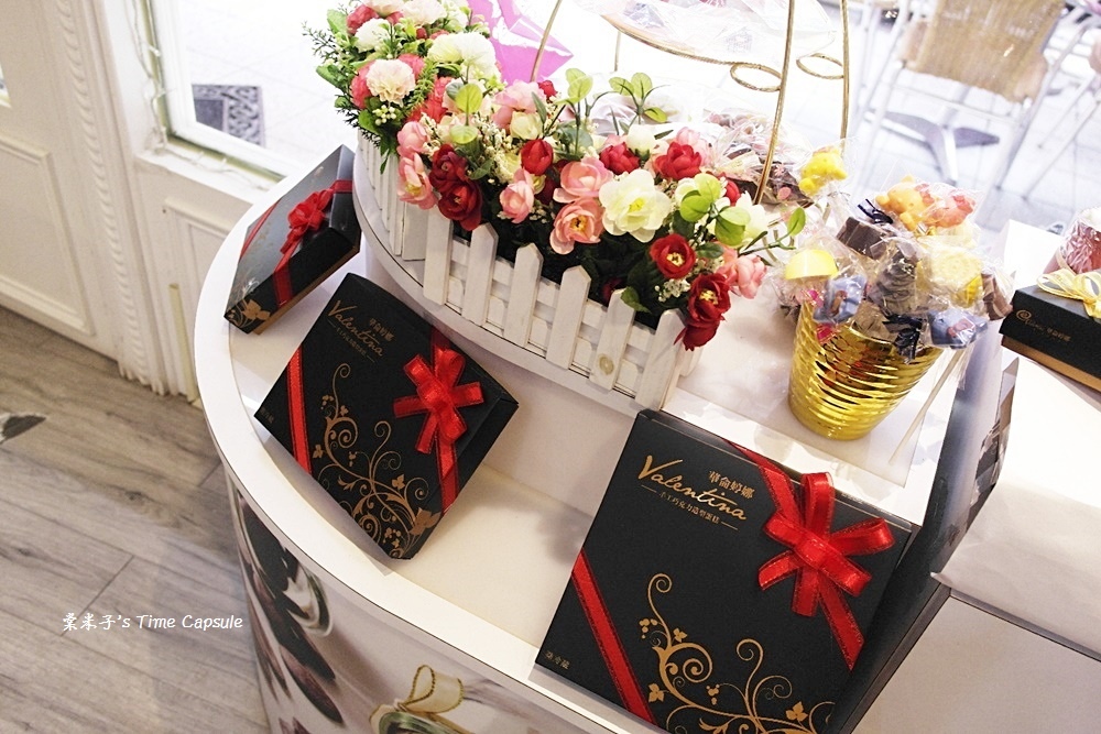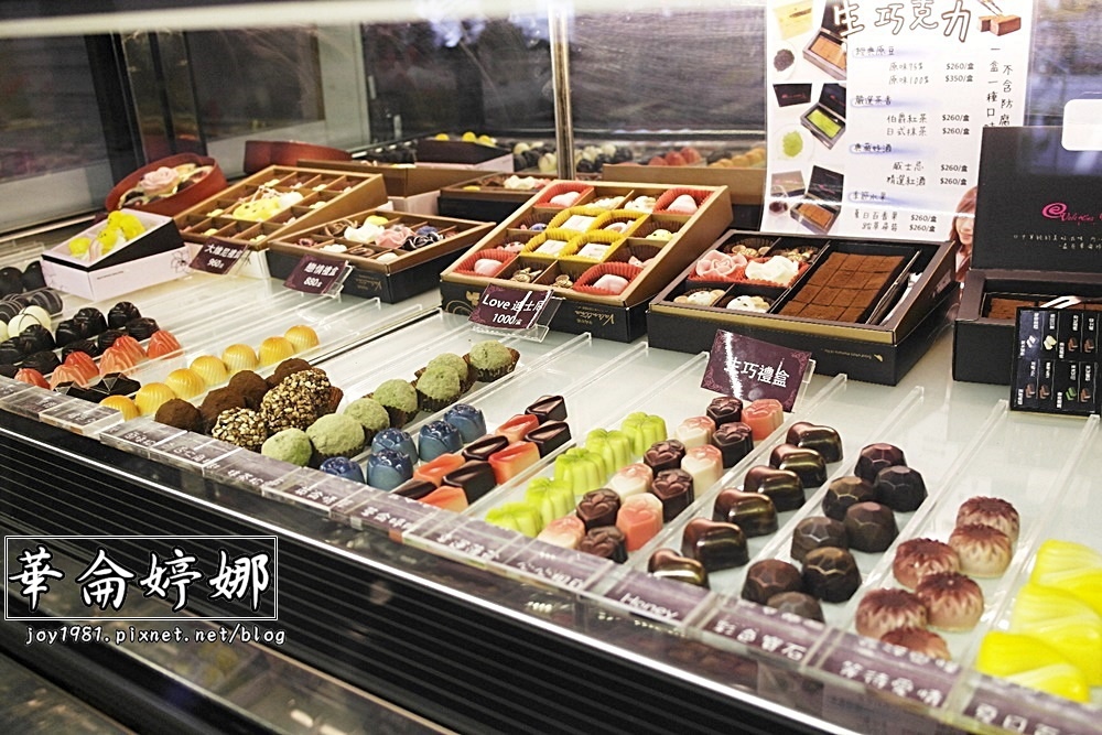 櫃台邊的玻璃櫃放著一顆顆顏色繽紛的手工巧克力,