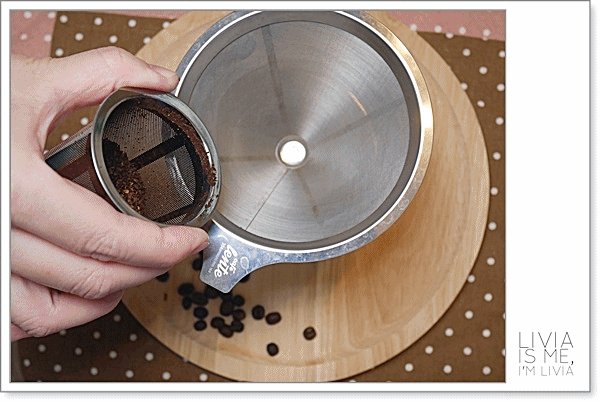 【將留在網子內的咖啡粉倒入咖啡壺中】