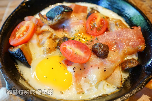 ▲主菜當中所使用的食材有「兩個半熟太陽蛋(可事先要求全熟)、培根、香菇、蘑菇、小蕃茄、雞肉」。