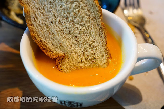 ▲南瓜濃湯是店家近期招待的湯品,剛好讓我用麵包沾來吃,結果味道還不錯耶,消解了麵包偏乾的問題。