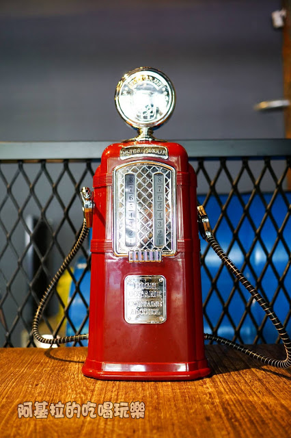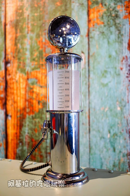 ▲在餐桌上我發現了三個造型很特別的物品,乍看之下很像加油站的加油機,再仔細地瞧了一番,原來是裡面裝著水的水壺,就跟加油槍一模一樣,接住板機,水就會從細細的管子流出來,感覺相當有趣,會令人忍不住想試用一下。