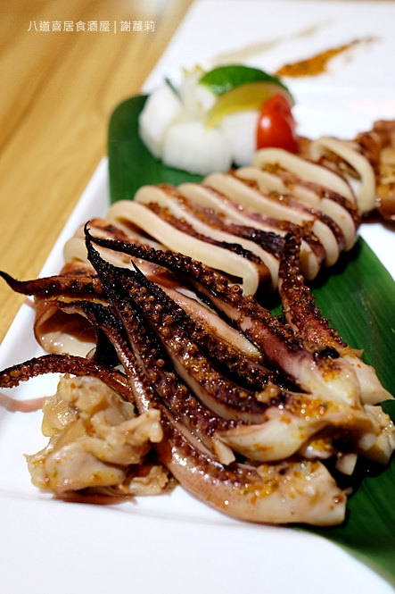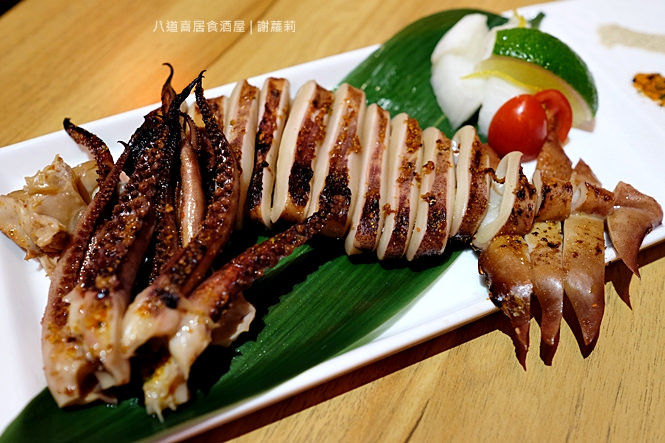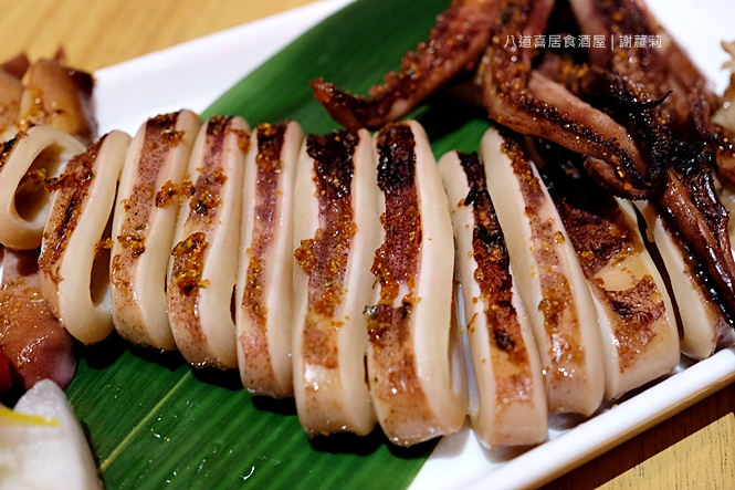使用整尾新鮮中卷以烤物的烹調方式呈現,一條一條切成圓圈狀,一旁加著檸檬、白蘿蔔泥及芥末鹽,客人可依自己的喜好選擇添加佐料,都能增添著中卷本身的清爽度。