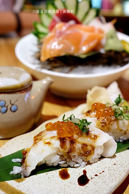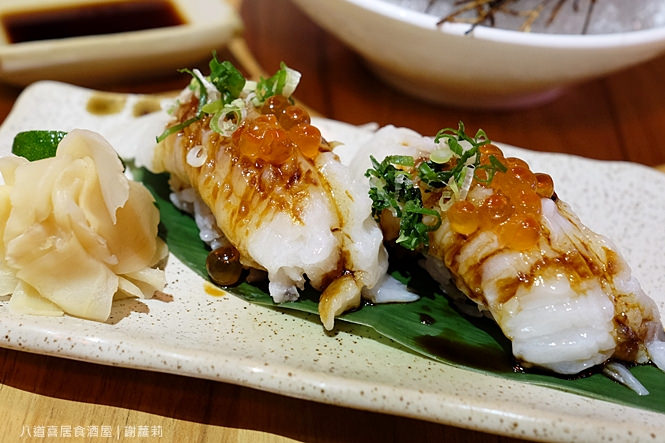 不曉得份量大器是不是八道喜的特色,這個比目魚也一樣也切得很厚實,噴槍炙烤的時間比例不算多,是同時保有緊實肉質、且帶著半融油花的雙重口感,你可以吃到它的Q勁、也有著入口即化的肥脥,沾一點點和風佐醬以突顯它的鹹香,而鮭魚卵更是讓它的華麗度更加乘。