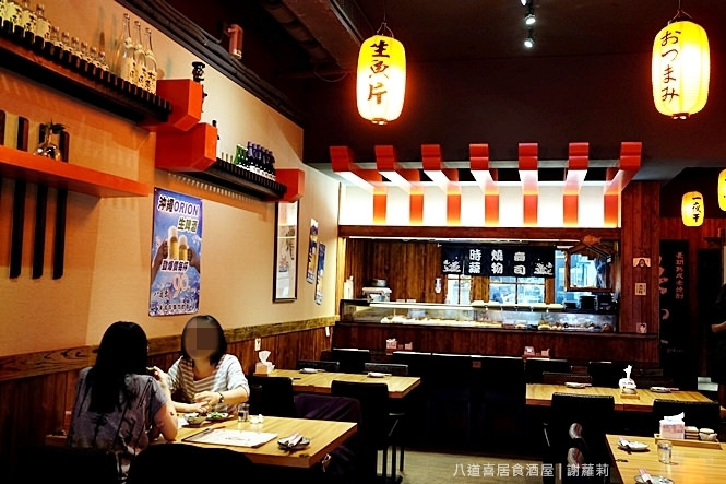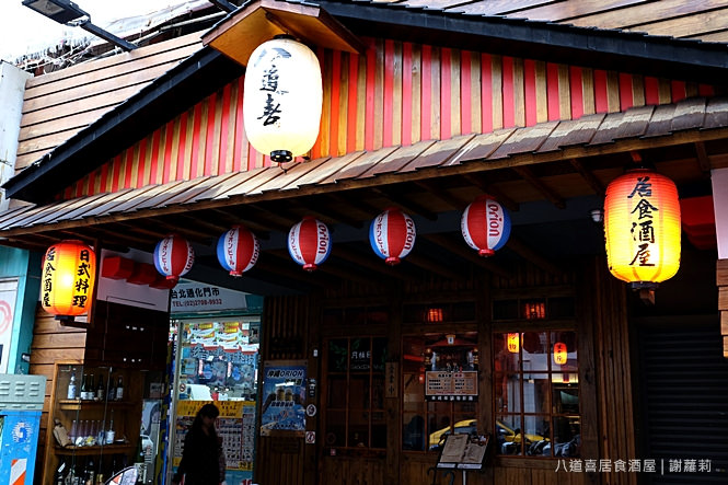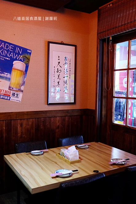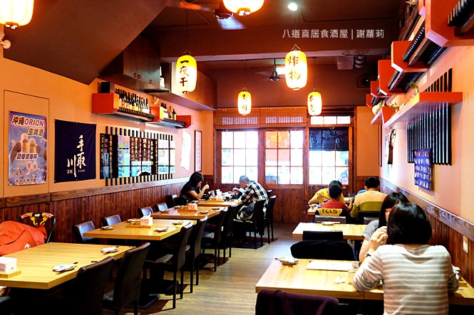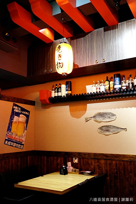 長條型的方正格局,木製元素延伸著,你可以瞧見,不論是牆壁、桌椅、天花板、甚至是鑲嵌在壁上的架子,盡是溫暖木頭所做成,日本海報點綴、各式日本清酒酒瓶裝飾,走進八道喜,你可以感受通化街另一種不同的氣象。