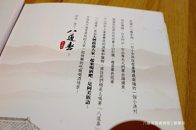 初聽聞八道喜的名字,直覺會認為應該是間提供日本料理的居酒屋,但實地造訪之後,才發現,原來這個取名來源可是有喻意的,這是一句阿美族語,意指豐收後大家一塊來喝酒吧!聽起來相當有意思,也讓人感受到背後流露著相聚的歡樂感。