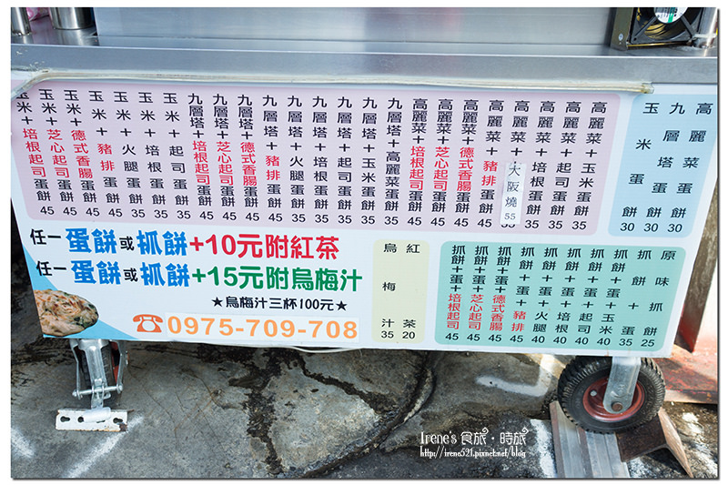 主要賣的是蛋餅跟蔥抓餅,口味相當多,無論是素的還是葷的,包菜或是包肉通通有,
