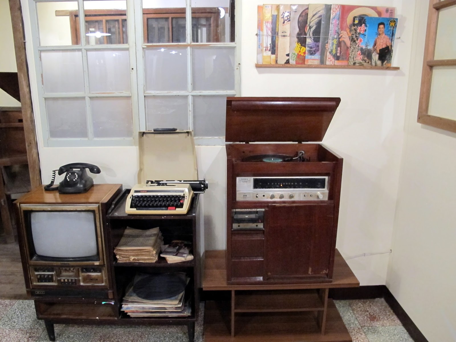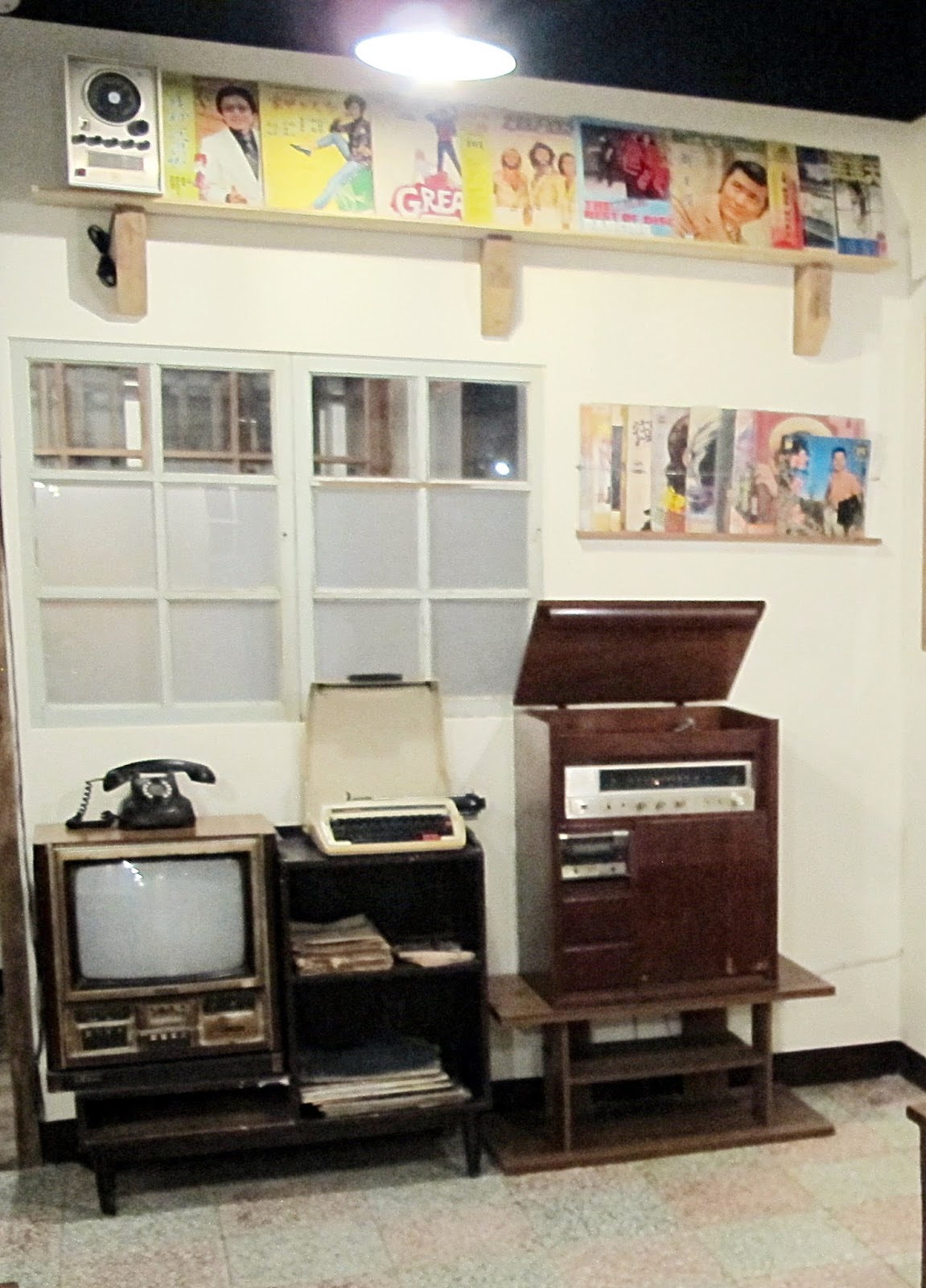 走上二樓可以看到更多早期吃飯使用器皿、鍋、碗、唱片、打字機、復古電視、、等