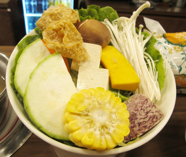 素菜盤,有板豆腐、香菇、豆皮、芋頭、南瓜、絲瓜、玉米、金針菇、紅蘿蔔、青菜、、等