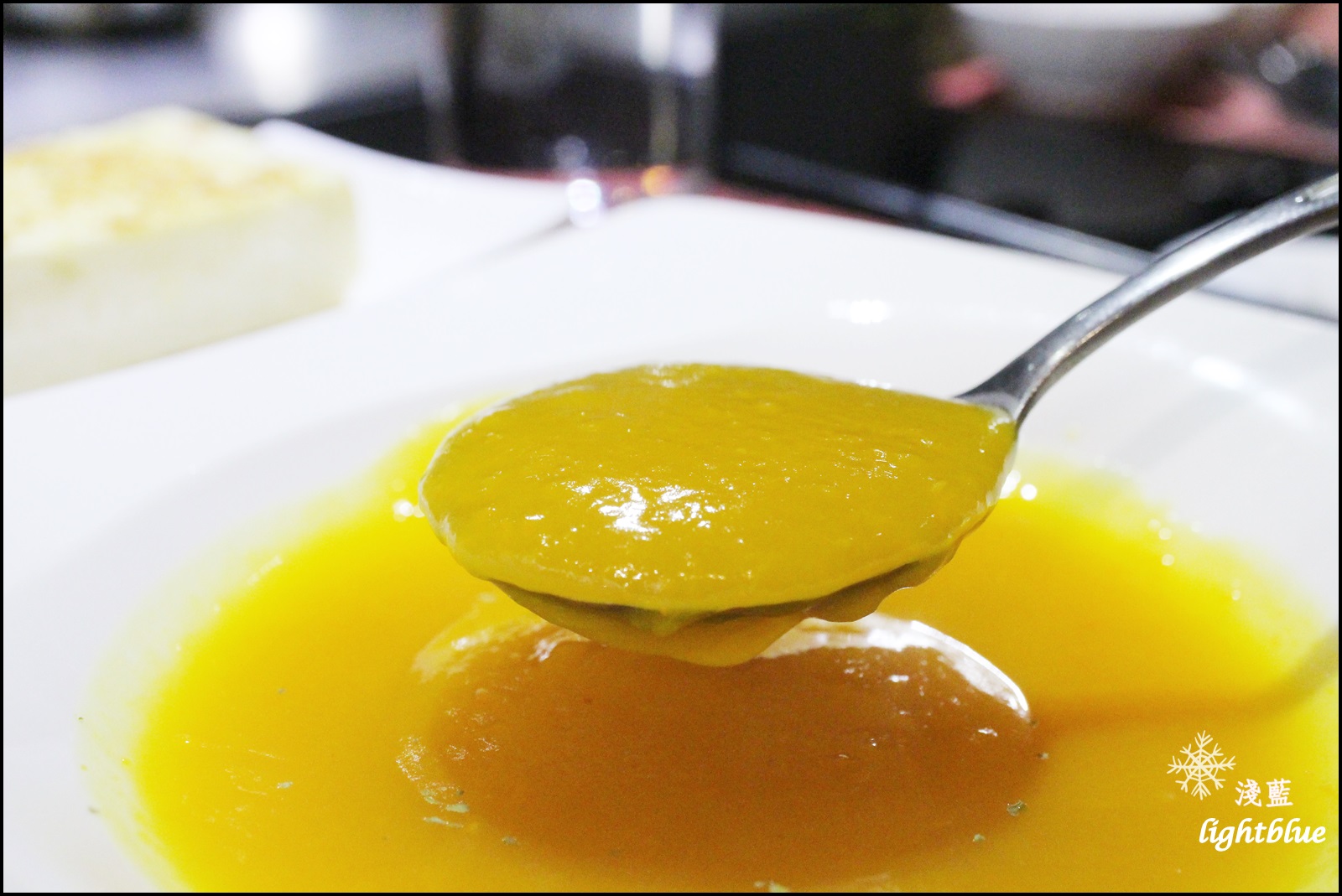 這是鮑魚,香川也很講究的使用了白色殼的南非鮑魚,比一般黑色殼的九孔鮑魚也要貴上一倍,他們在食材的選擇上有很大的堅持不妥協呢!黃色的是海膽醬,也是不手軟的以一整顆海膽下去打,味道極為香濃且帶有怡人的甜味,我超想跟老闆再要一塊麵包沾著把海膽醬全部抹乾吃光!