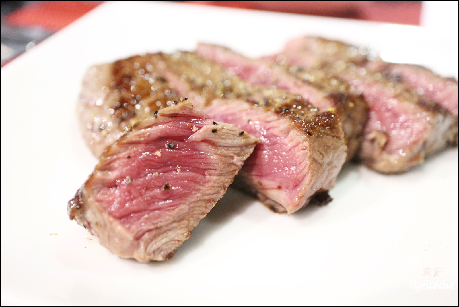 不一會兒,牛排就香氣四溢的到我面前來了,這是沙朗牛排,主廚處理成為兩種吃法,一種是單純的肉,一種是帶筋帶油的部位,一次滿足兩種口感