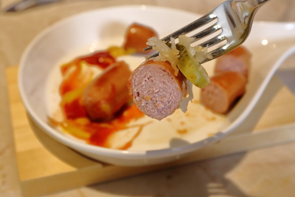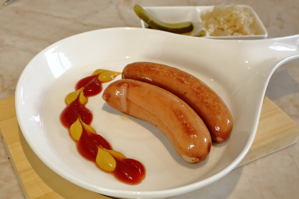 鮮美多汁且深富彈性的德國香腸,加上芥末和酸菜一起享用滋味奇佳