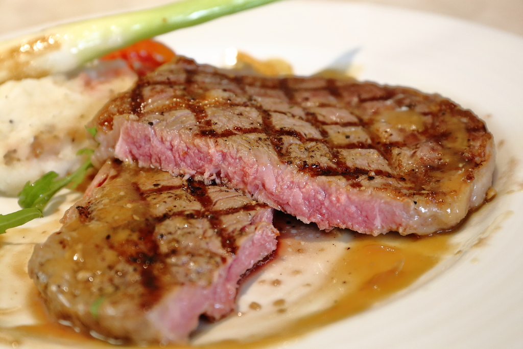 牛排肉汁飽滿有一定厚度,帶著粉紅玫瑰色的色澤,看起來極度誘人~