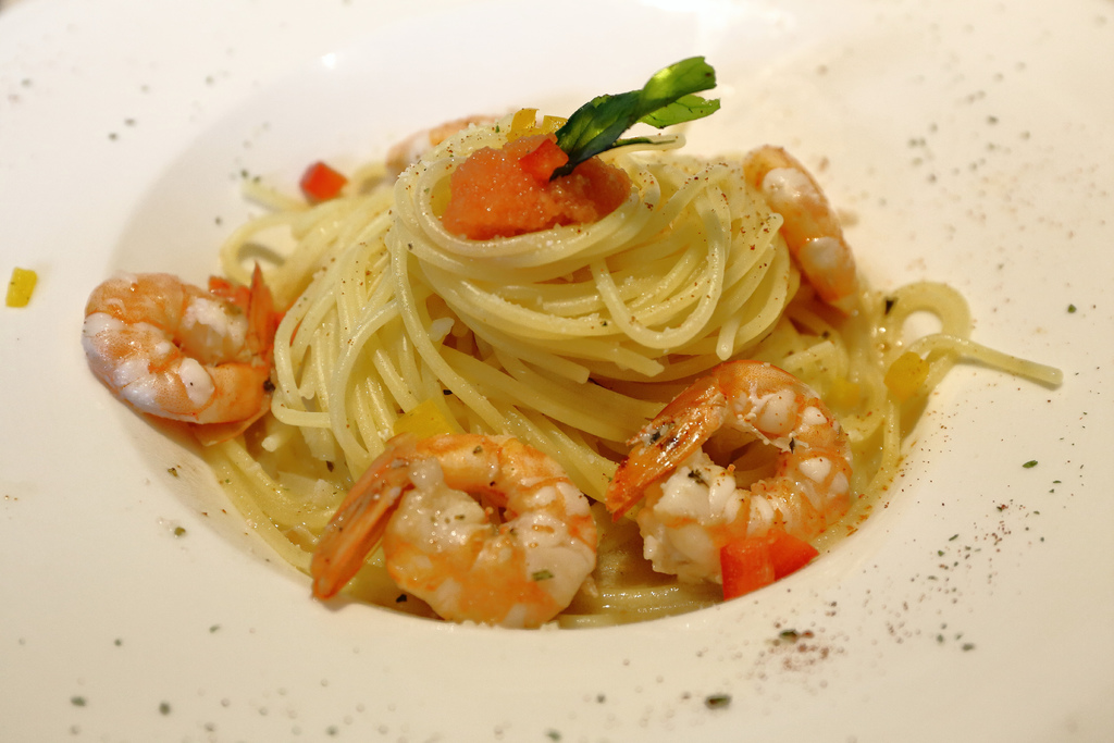 滿滿的鮮蝦及鹹香的明太子,將義大利麵醬汁和明太子攪拌均勻後,吃在嘴裡會有嗶波嗶波口感,更襯托
