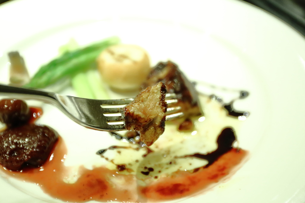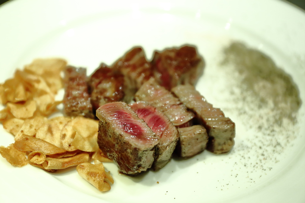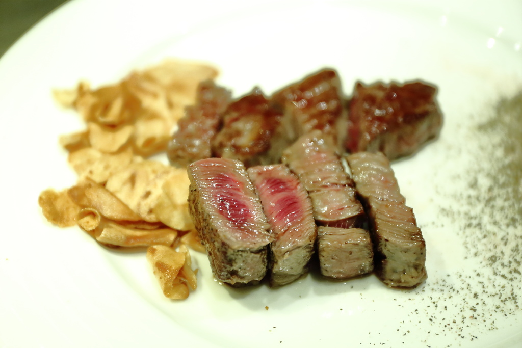 和牛牛排的大理石油脂花纹分布非常均匀,咀嚼起来口感滑嫩,果然是最高級的牛排之一