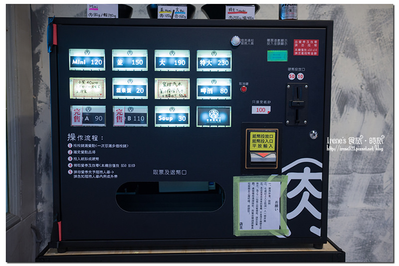 跟日本餐館一樣,需先購買餐卷,但種類少,不會站在售票機前猶豫很久,