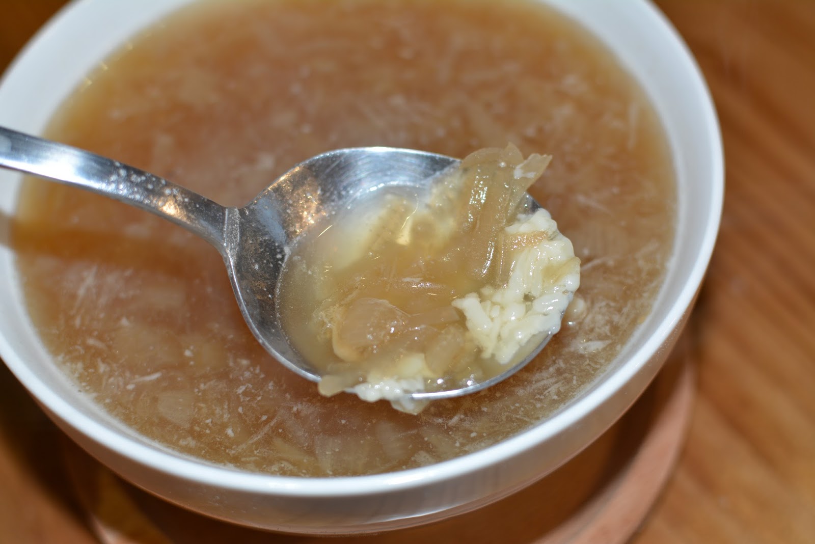 以雞湯為湯底的法式洋蔥湯喝起來很清甜,湯裡吃得到香濃起司。