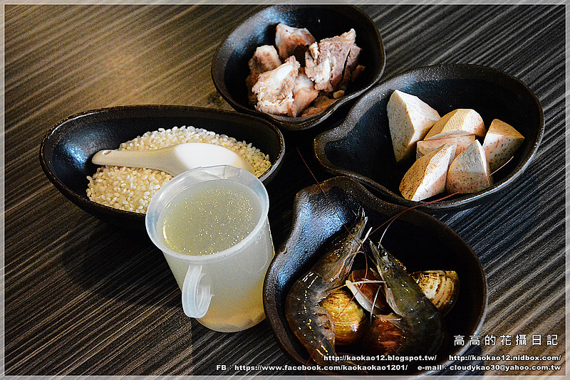 服務人員依序幫我們下煮粥的食材:白米、芋頭塊、排骨,