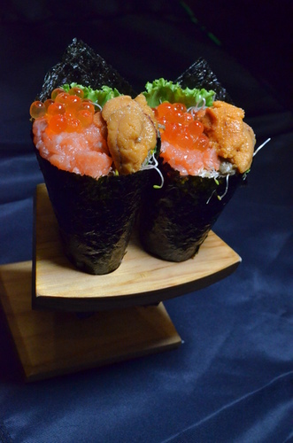 這是1314套餐的-愛戀滋味 : 裡面有日本馬糞海膽、鮭魚卵、日本松葉蟹膏、鮭魚泥、苜蓿芽、蟹味條~超豐富的手卷~咬下去每一口都有不同的口感跟味道~很讚捏~小的跟我搶著吃....