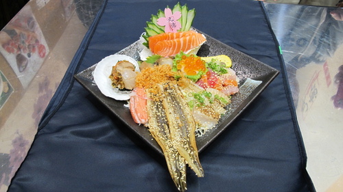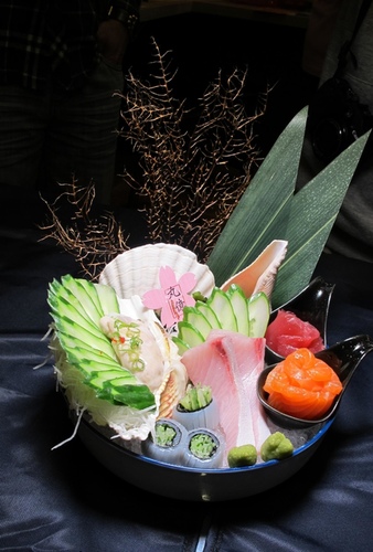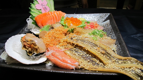 這是1314套餐裡的-花現幸福 : 裡面有水晶卷(生的透抽包海苔跟小黃瓜)很清爽的口感~、日本生蠔超大顆的~(不敢吃生蠔的可以換干貝)、生魚片(全數是老爸的菜!!)吃起來只有新鮮而已!!!鮮甜的魚肉~QQ的口感~真的很讚!!!