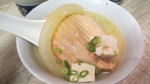 香甜的湯頭~鮭魚和的味增香氣~熱熱的喝~會讓人一直想續碗(那個長條的食物竟然是白蘿蔔~)