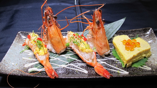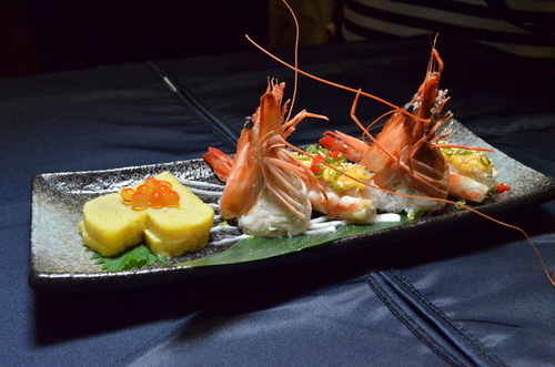 這是1314套餐的-意蝦情迷 : 裡面就是草蝦炙燒起司加上飛魚卵、甜的玉子燒(還是愛心的型狀唷!!)連蝦頭裡都塞滿壽司飯!!壽司飯跟蝦頭的清甜一起吃下去~好吃唷!!