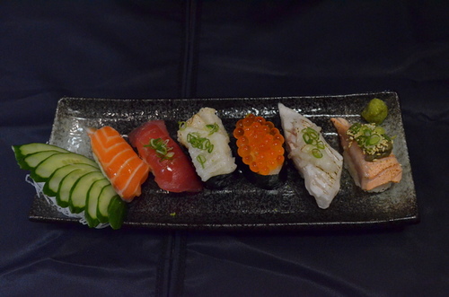鮭魚握壽司、蔥花鮪魚、比目魚鰭邊肉、鮭魚卵軍艦、鰭邊肉炙海鱺、蟹膏炙鮭魚