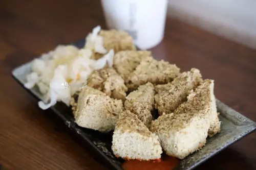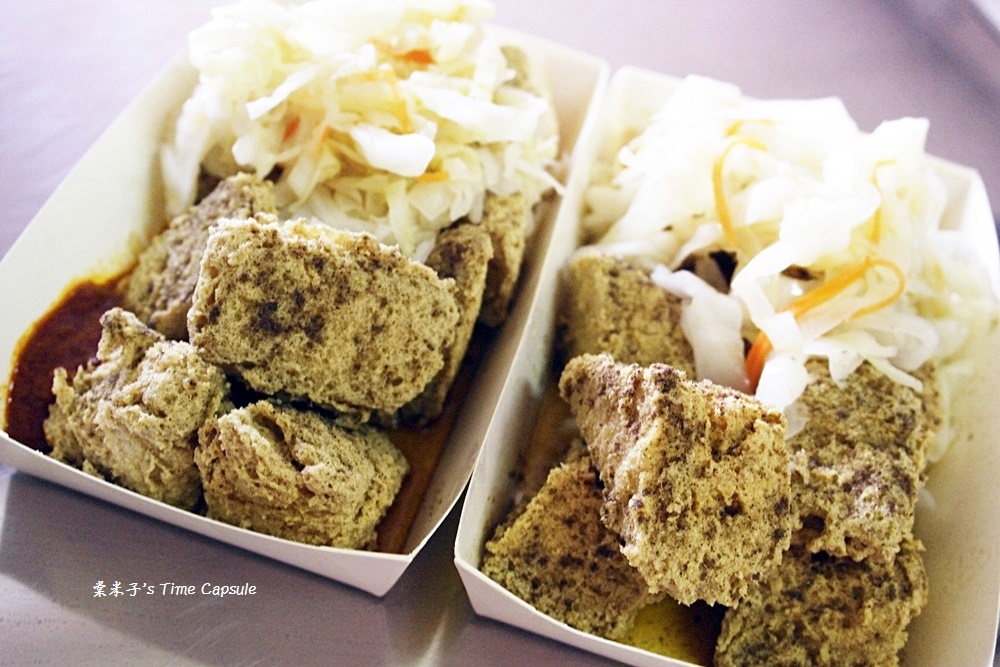 除了大塊的臭豆腐外搭配上自製泡菜並淋上店家特調醬汁,