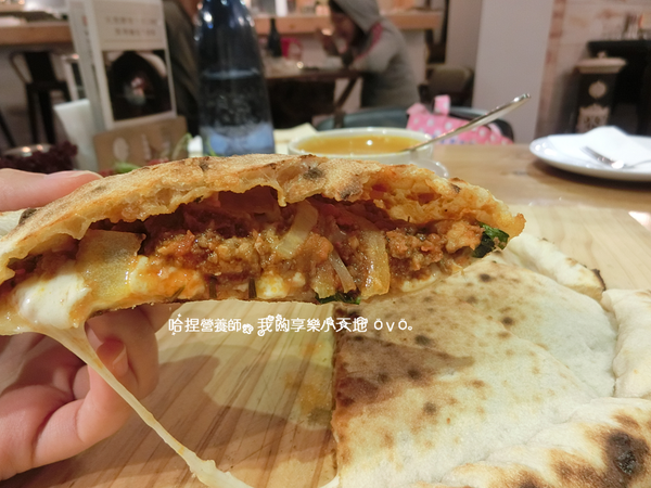 披薩的餅皮包覆兩種起司與波隆納肉醬,特調的紅醬帶有九層塔的香氣,我超愛這道料理的~因為他的餅皮有兩種口感,邊緣紮實有嚼勁、中間薄脆,加上濃郁飽滿的內餡,咬下去先是有麵包的口感,在口中餡料則散發出濃郁的味道,細細咀嚼還能品嚐出香料的芬芳