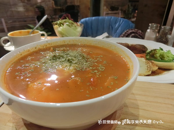 原本覺得這濃湯的價位有點不親民,但實際看了他的湯料就不會這樣覺得了!滿滿的海鮮及大量蔬菜,讓每口湯都不單調,口口都是驚喜!湯頭還有海鮮濃郁的味道及蕃茄自然的鮮甜,不額外做勾芡,喝的是食材本身的濃稠口感