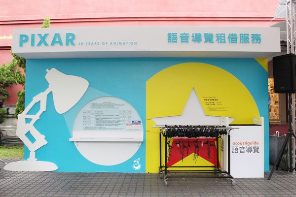 ▲前往歷史博物館,可搭乘捷運紅線至中正紀念堂站,由2號出口出站,往海南路一直走約十分鐘即可抵達!《皮克斯30周年特展》從售票亭的樣貌開始就很皮克斯,兩樣皮克斯的象徵-頑皮跳跳燈的燈光打在售票窗口上,彩球則是涵蓋語音導覽的租借窗口。