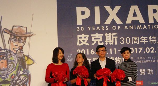 ▲長榮航空李協理、皮克斯策展人Elyse Klaidam、張館長和台新銀行文化基金會鄭執行場一同剪綵為《皮克斯30周年特展》拉開序幕