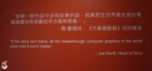 ▲展覽中會穿插一些皮克斯工作人員的語錄,個人很喜歡這段話,如果沒有故事的話,就算有再好的繪圖技術也沒有意義,我想這也是為什麼皮克斯的動畫電影都是很有情感和意義的好故事。而皮克斯的創辦人兼創意總監約翰.拉薩特認為動畫成功的三大黃金法則:吸引眼球的「故事」、令人印象深刻的「角色」以及逼真的「世界觀」,《皮克斯30周年特展》也是按照這三種分類,帶領觀眾從三個層次去觀看動畫。