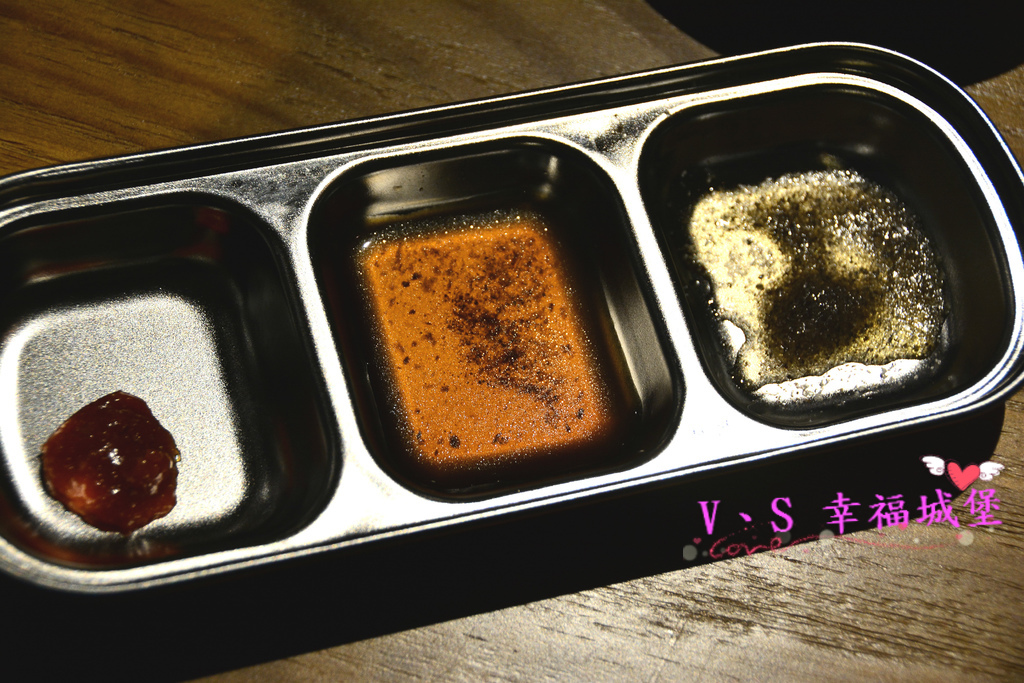 三格的醬料碟,由左至右依序是 ~ 韓式辣醬、烤肉醬、麻油胡椒鹽