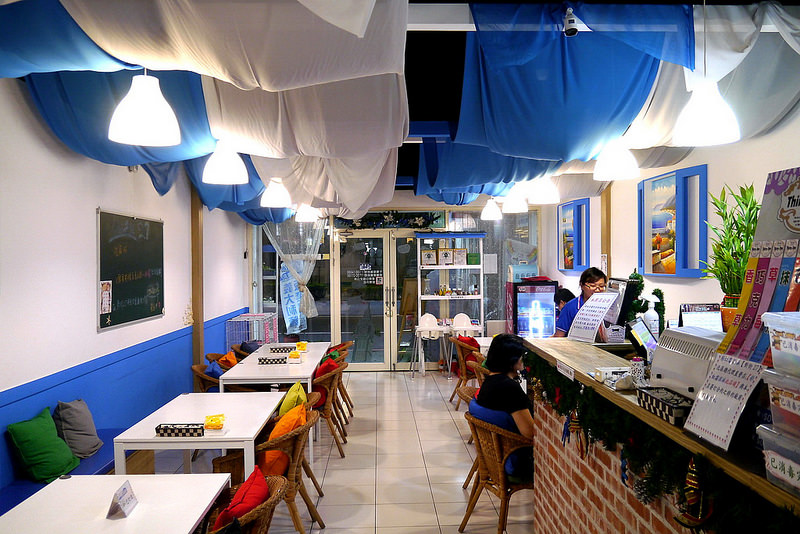 店內整體的裝潢以藍白色調為主,沒有過多浮誇的裝潢,簡單又舒服,座位間的安排也頗寬敞。