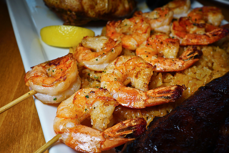 香料烤蝦非常好吃, 很搭飲料, 底下的飯也不錯