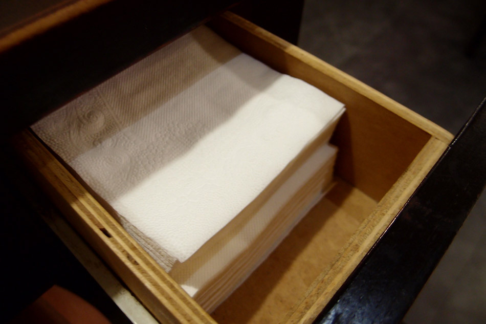 面紙就在座位旁的抽屜內,這樣不會發生衛生紙要傳遞來去的畫面