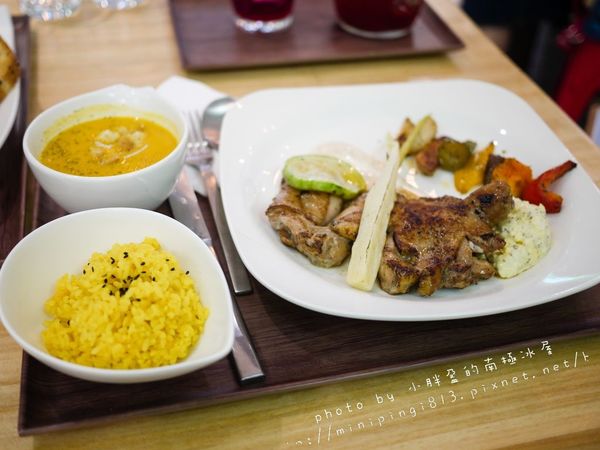 滿滿一大盤雞腿排與烤蔬果 旁邊是薑黃飯與南瓜湯